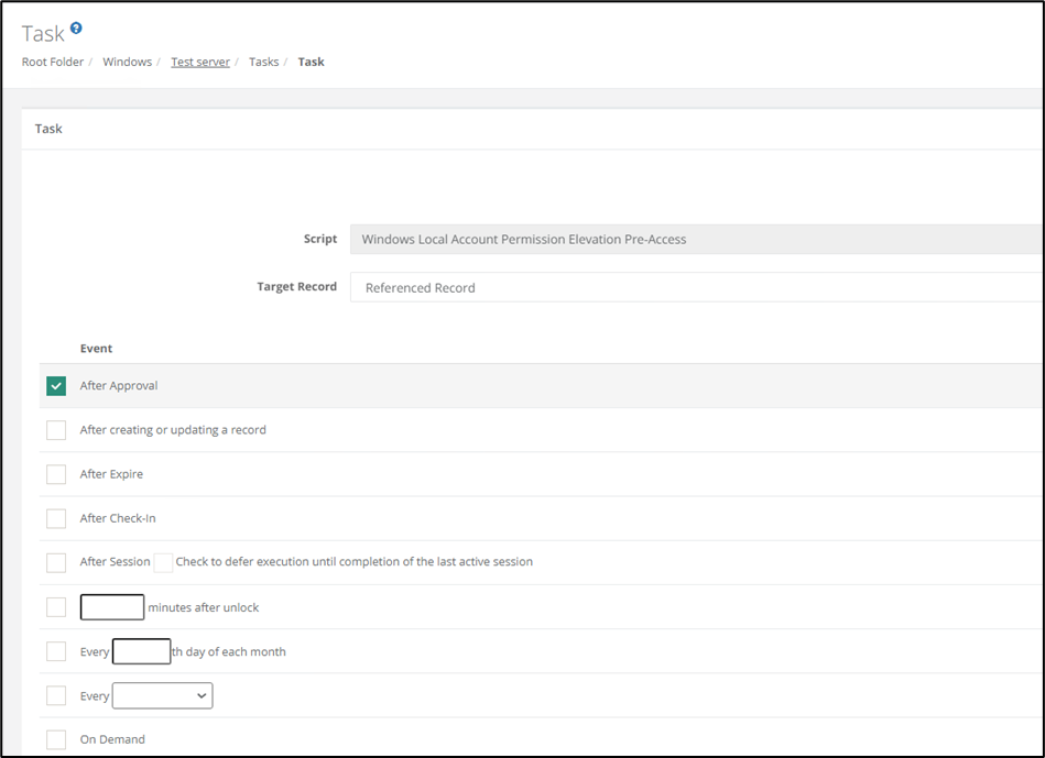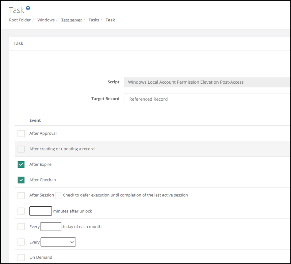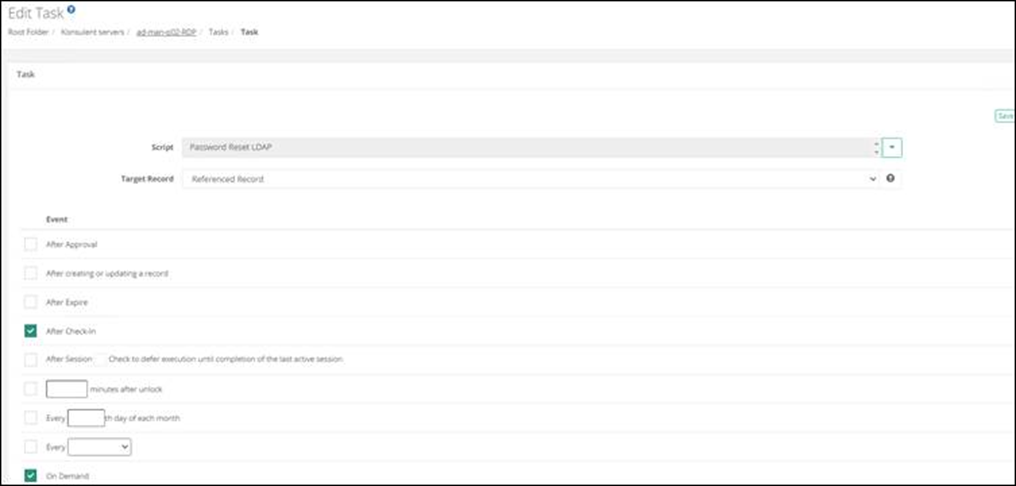 Tasks is a built-in feature in Imprivata PAM that basically is scripts that you can use on various event triggers. It comes with a lot of scripts out of the box, but you edit them to your needs, and you can make your own.